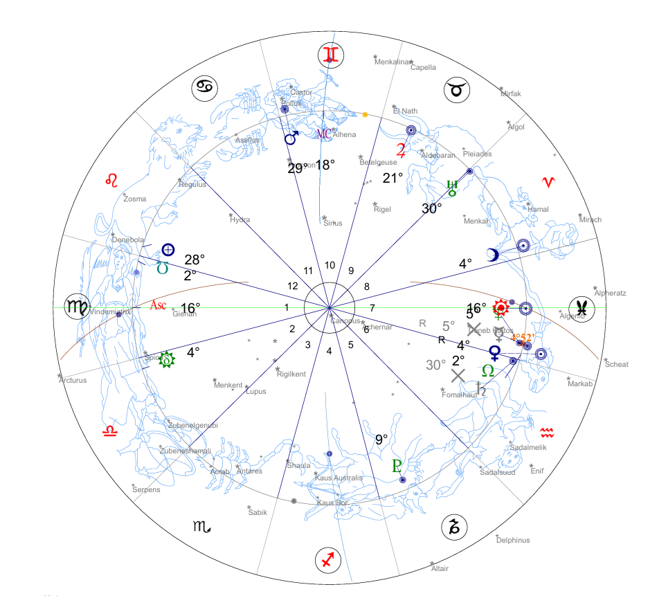 Dando un’occhiata alle stelle fisse, vediamo che l’astro di Marduk si trova sul grado eclittico di Mirzam (β Canis Majoris), mentre le stelle con le quali sorge in unione più stretta (paranatellonta) sono Mebsuta (ε Geminorum), Tejat (μ Geminorum) e Bellatrix (γ Orionis). La stella del Cane maggiore è tradizionalmente di natura venusiana e perciò benefica, come benefica è anche Tejat, che segna il piede del primo gemello ed è di natura Mercurio-Venere – gli effetti di Mebsuta invece, stella nella parte mediana sempre del primo gemello, sono più problematici ed assimilabili a quelli di Saturno. Bellatrix poi è la stella che segna la spalla sinistra di Orione ed è un astro abbastanza turbolento e bellicoso, della natura di Marte e Mercurio. Della stessa natura planetaria sono anche le prime due stelle di Pegaso (Markab e Scheat, rispettivamente α e β Pegasi) che culminano al Medio Cielo, mentre poco più defilata dal lato della IX casa troviamo la regale Fomalhaut (α Piscis Austrini), astro mistico ed artistico di natura Venere-Mercurio. Interessante anche la posizione di Venere in corrispondenza di un’altra stella regale e fortunata, ma anche guerriera, Aldebaran. Vediamo quindi che anche le stelle fisse più coinvolte confermano il complesso quadro celeste che accoglie la levata eliaca di Giove, fatto di luci ed ombre, e che preannuncia tempi certamente turbolenti ma non senza speranza.